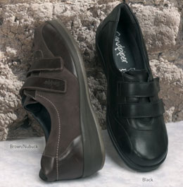 Bolton - At last, a boot that is easy to put on and off. With the very wide opening and the low cut back, this really is a boot for problem feet. The deep cushioned padding around the ankle and on the tongue keps your foot snug and secure, while the removable insole gives you even more room for thicker socks! An ideal boot for those colder months. Available in Black or Chestnut, and in sizes 36-42, 4E-6E. Filton - The punching and stitch detail on this design gives the latest look to a really practical style for wide or difficult feet. The touch fastening bar, gives a huge amount of adjustment, and the removable insoles ensure a perfect fit. If you worry about how your feet look, yet need extra width and depth, then take a look at this style for this season. Available in Black, Red or Black/Burgundy, and in sizes 36-42, 4E-6E. Two removable insoles give 3 fitting options on each foot. More Ladies Shoes .... |
