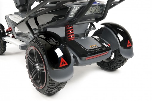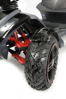 The new Vita X is the latest and most robust member of the Vita family. Equipped with enhanced full suspension featuring double wishbone technology at the front, and a mono shock absorber at the rear the Vita X delivers sturdy and stable performance in non-extreme off-road scenarios. Sporty black finish with striking red flashes. Utilizing revolutionary technology from the motor cycle industry the Vita X has a truly smooth ride. It's robust rear wheel drive system with chunky tyres propelled by a powerful 900w motor and 200amp controller, provide one of the smoothest and most comfortable rides that you will find. An intuitive liquid crystal display instrument console clearly shows accurate real time information of everything you need including speed, time and temperature. A handy trip computer shows how far you have travelled and a battery condition indicator shows the amount of charge remaining so you will never be caught short. The whole instrument panel is conveniently back lit so it is easily read in low light. Speed control levers on either side of the console are designed to give forward and reverse control from either side, the top speed can be easily controlled with a handy hi / low switch limiting the scooter to either 4mph for pavement use or 8 mph for use on the road. Vita has been designed to take practically everything on for you, at the touch of a button. Its onboard control computer gives you smooth pull-aways and automatic braking. Everything has been thought of, there is even an emergency brake that stops the scooter and cuts the motor in case of emergency. Fully adjustable comfortable leather racing seat offering additional lateral support, with adjustable backrest, headrest and armrests, all round black polished alloy wheels, chunky tyres and large 100mm (4") ground clearance, allow Vita X to negotiate a variety of terrain with ease. |